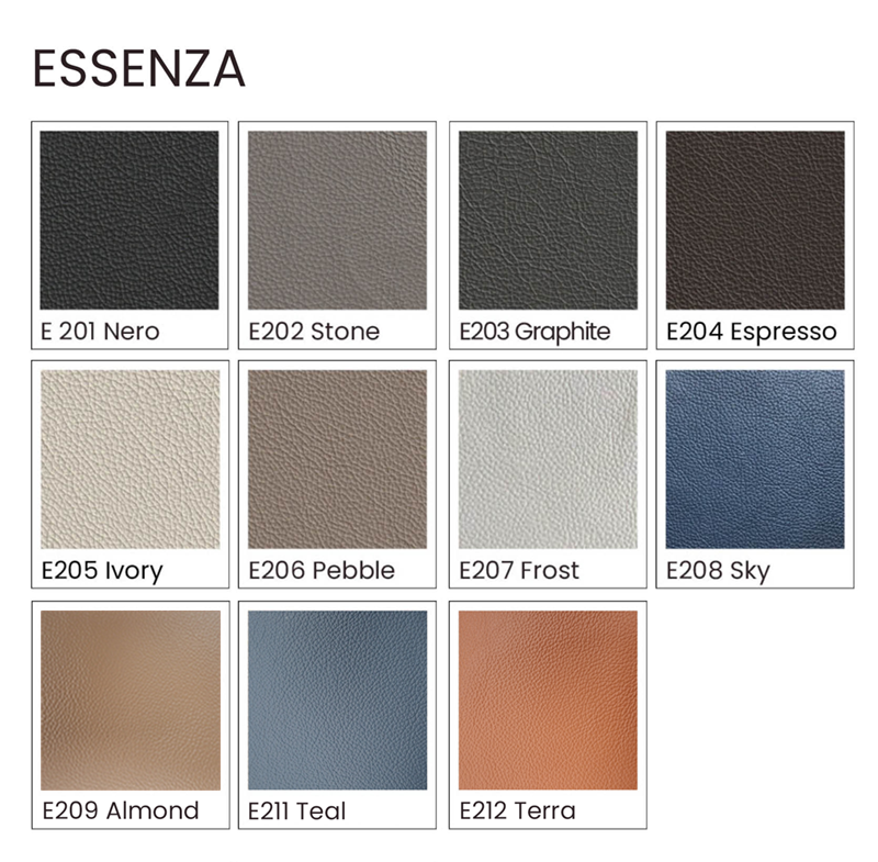 ESSENZA is a top grain, pigmented, upholstery leather with a thickness between 0.9-1.0 mm. It has been corrected, and grain embossed to create a uniform appearance in both color and grain texture.